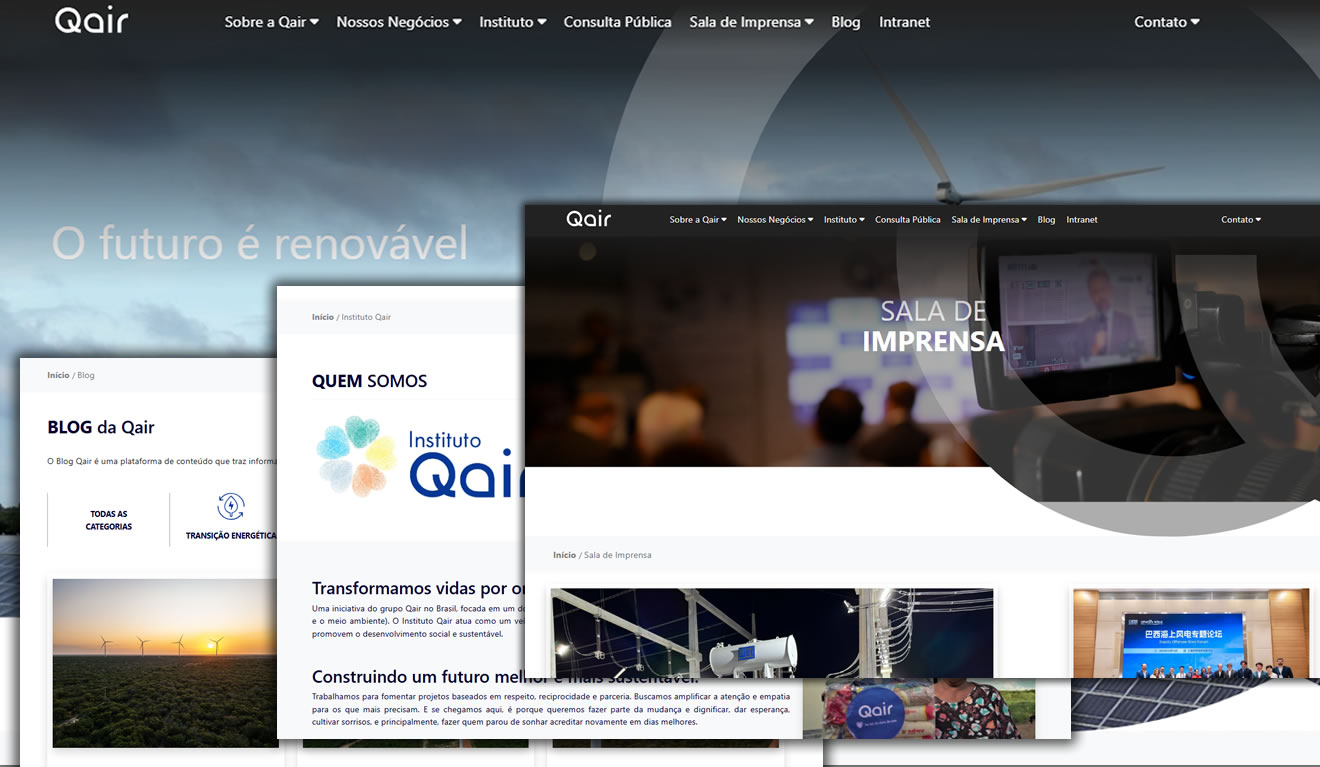 Desenvolvemos o novo portal da Qair Brasil criando um layout moderno, responsivo e limpo, gerando uma navegação suave para os usuários.